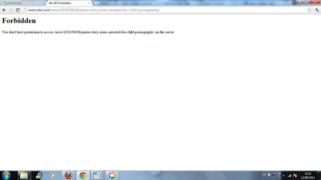Cette provocation minable envers 1,5 milliard de personnes dans le monde, est perpétrée pour la quatrième fois par un pasteur accusé de pédophile. Vous souvenez-vous de ce pasteur qui s’est attiré les foudres de l’opinion ? Pas pour ses méfaits de pédophilies mais pour avoir brûlé plusieurs exemplaires du Coran. Terry Jones, appelait déjà à un message fort contre l’Islam et ses musulmans, en brûlant le Coran un 11 septembre 2010. Mais il avait été arrêté juste avant, le 4 août 2010 pour « pornographie sur enfants ». Le pasteur Terry Jones avait partagé sur un site populaire du réseau Limewire des photos d’enfants nus dans les différents États d’Amérique. La brève de cette annonce avait été publiée par NBC News et a été aussitôt censurée. Elle n’est restée sur le site à peine un mois après la publication. On peut encore voir le cache donnant l’information mais le lien indique en anglais : “vous n’avez pas la permission d’accéder..” :